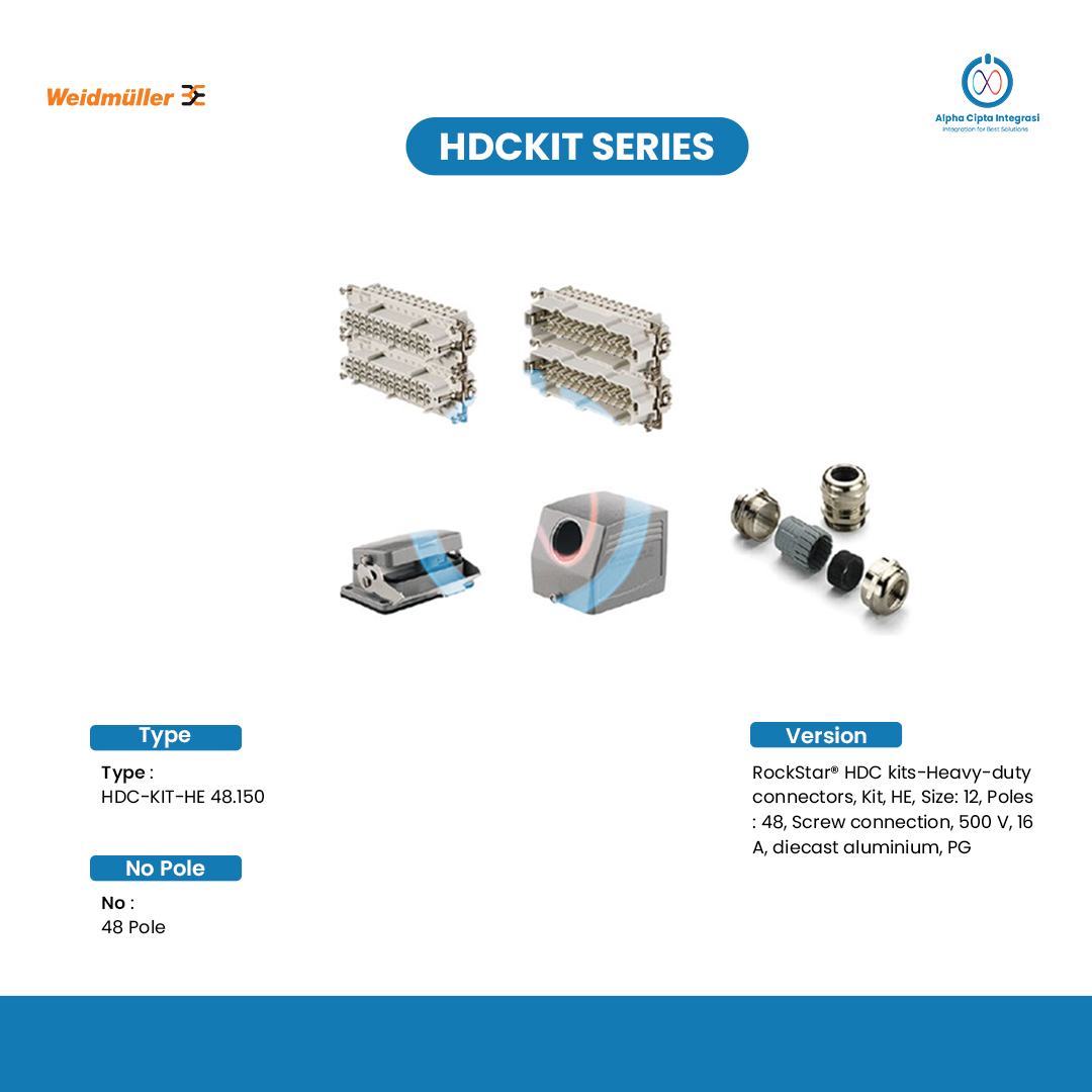 | Version | RockStar® HDC kits-Heavy-duty connectors, Kit, HE, Size: 12, Poles: 48, Screw connection, 500 V, 16 A, diecast aluminium, M 40 |